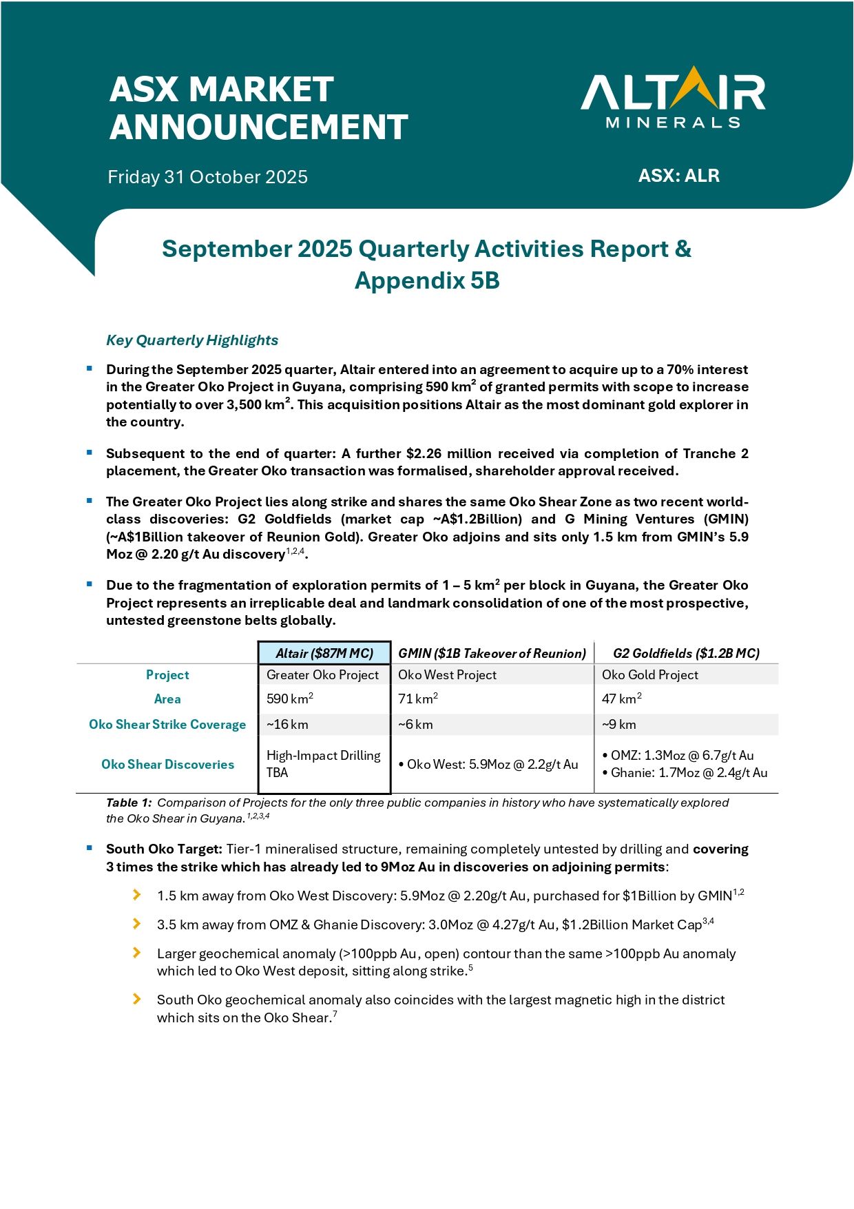 - Post-quarter, Altair raised $2.26M (Tranche 2), finalising the Greater Oko deal with full shareholder approval.