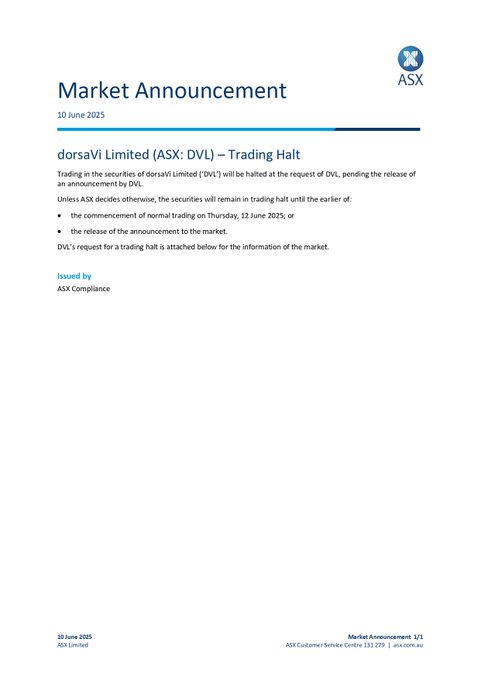 dorsaVi (ASX: DVL) has entered a trading halt pending a major announcement involving a Worldwide Exclusive RRAM Licence Agreement and a capital raise. Something exciting is definitely cooking, watch this space! Expected update by Thursday, 12 June 2025. The trading halt is requested pending an announcement by the Company to the market in relation to execution of a Worldwide Exclusive RRAM Licence Agreement and Capital raising (Purpose).