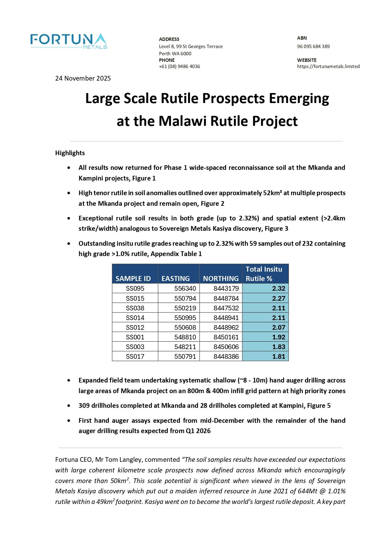 - All Phase 1 soil results received, outlining high-tenor rutile anomalies over ~52 km².