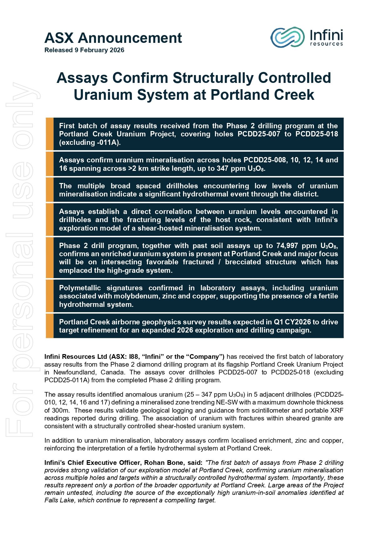 Infini has received the first batch of laboratory assays from its Phase 2 drilling program, confirming uranium mineralisation consistent with a shear-hosted, district-scale hydrothermal system.
