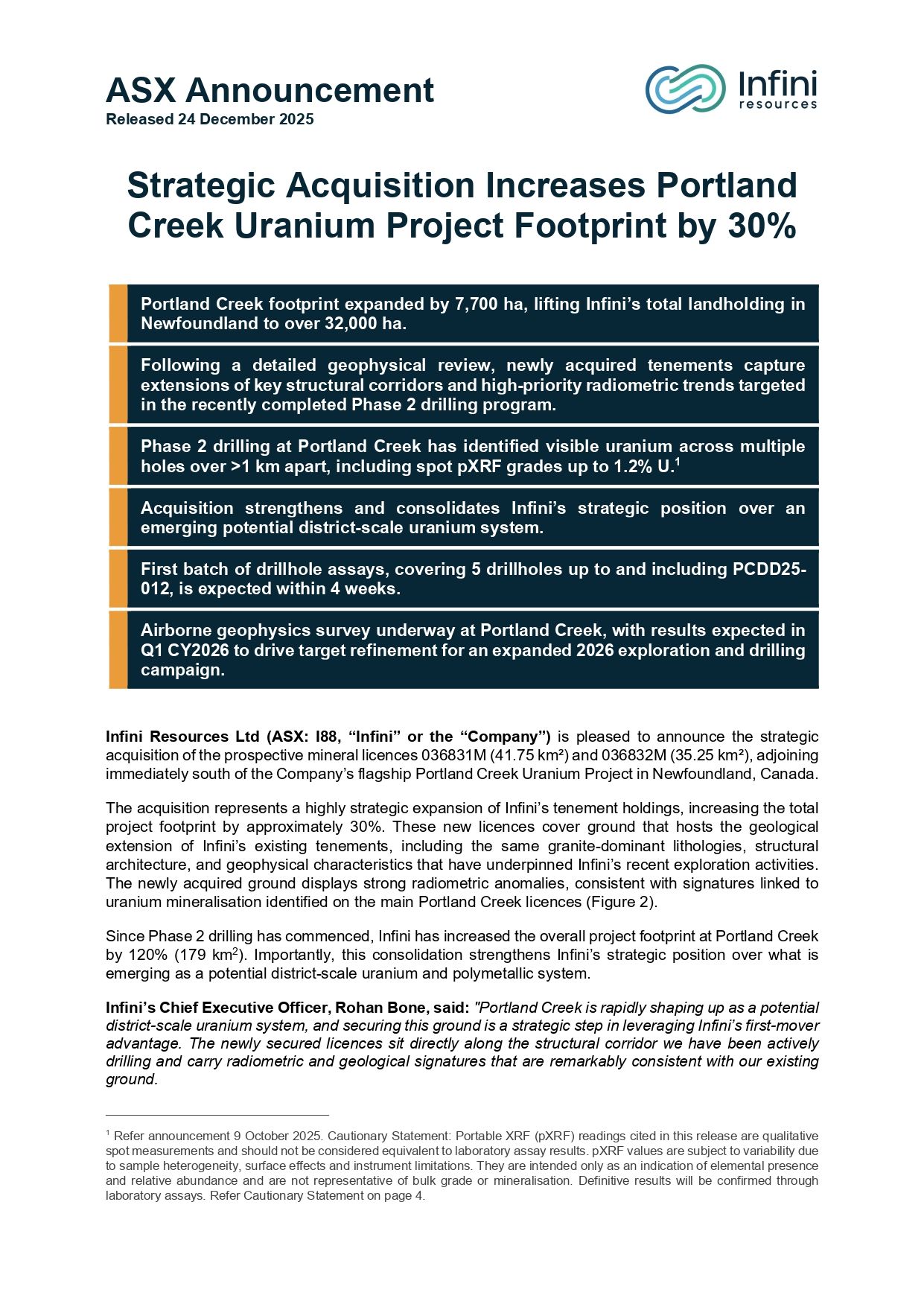 - Acquisition consolidates Infini’s position over a potential district-scale uranium system