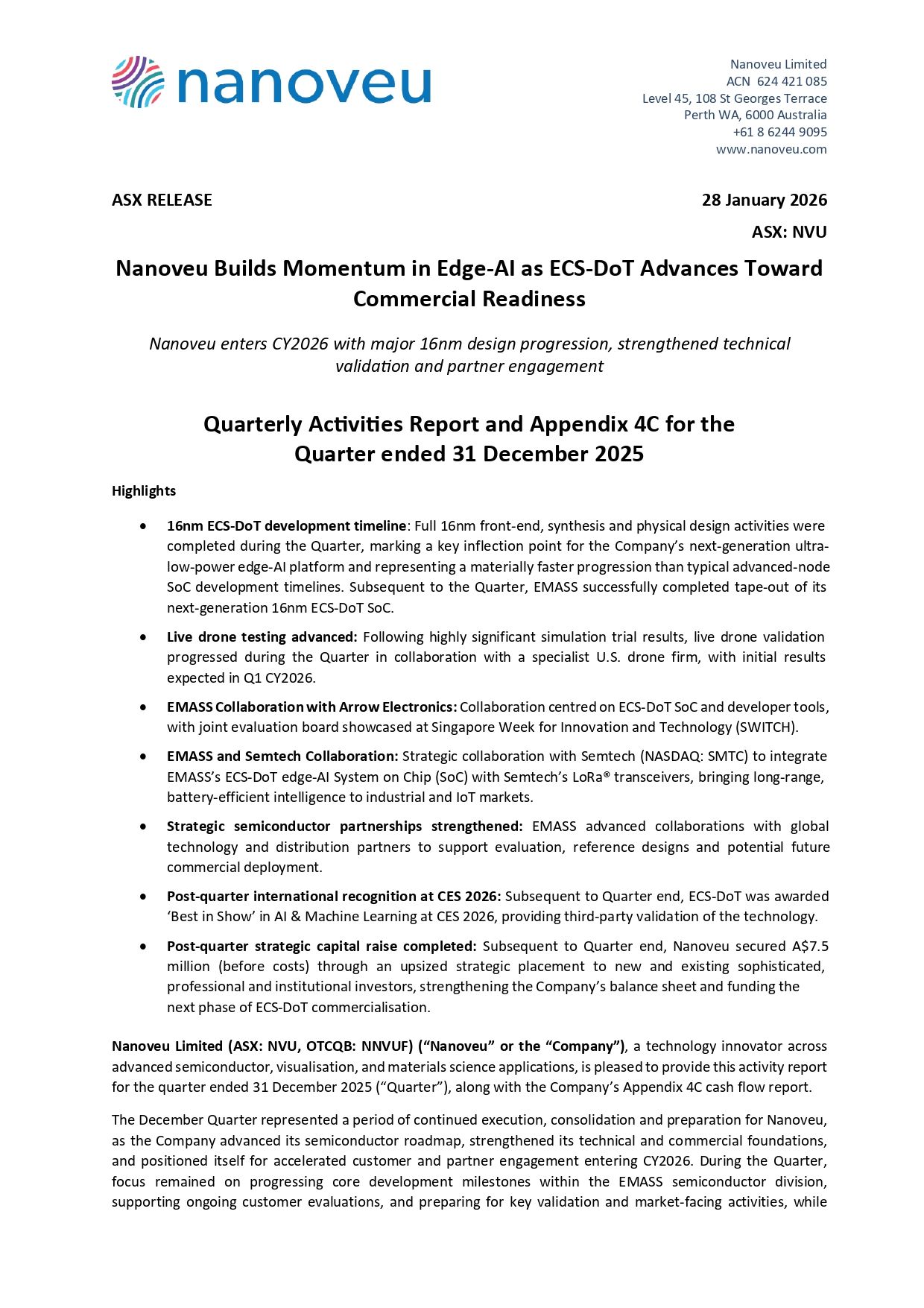 - Live drone validation advanced with a specialist U.S. partner following strong simulation results; initial data expected Q1 CY2026