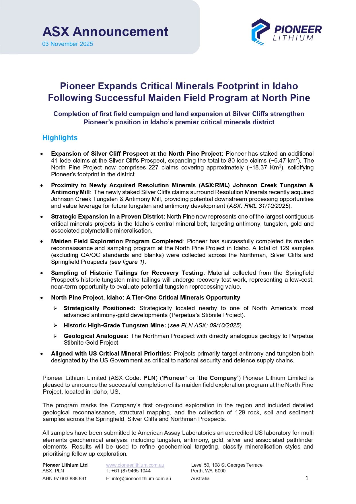 - North Pine now ranks among Idaho’s largest contiguous critical mineral projects targeting antimony, tungsten, gold