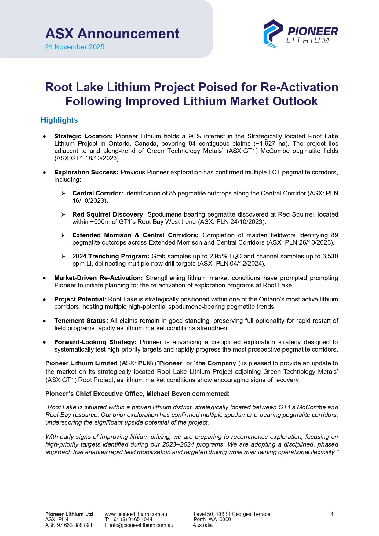 - Exploration planning underway targeting high-priority pegmatite corridors